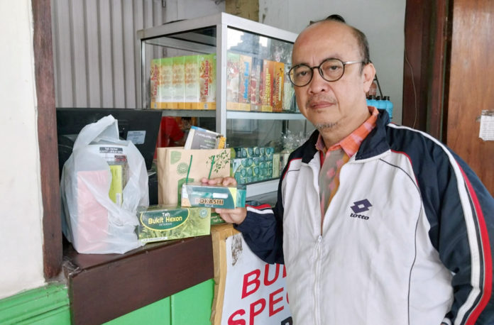Pak Wira, saat membeli produk Minyak Oles Bokashi dan Teh Intaran di Konter Pak Oles, Jalan Letda Kajeng, Yangbatu, Denpasar Timur.