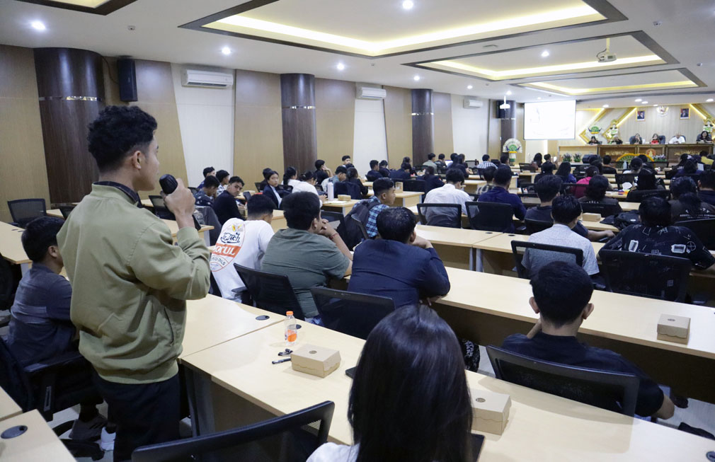 Seorang mahasiswa Fakultas Pertanian dan Bisnis Universitas Mahasaraswati (Unmas) Denpasar bertanya kepada Dr. Wididana dalam seminar bertajuk Inovasi, Tantangan, dan Peluang di Era Modern”.