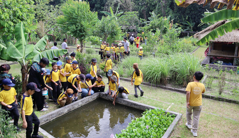 Selain itu, siswa juga diajak berkeliling kebun untuk mengenal lebih dekat berbagai jenis tanaman yang dapat dijadikan bahan loloh (jamu tradisional Bali), serta berinteraksi langsung dengan hewan ternak seperti sapi dengan memberi pakan berupa rumput gajah.