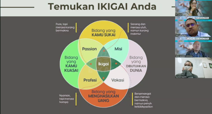 “Apa yang kamu kuasai adalah profesi, apa yang kamu sukai adalah passion, apa yang dibutuhkan dunia adalah misi, dan apa yang menghasilkan uang adalah pekerjaan atau vokasi. Ketika semua itu bertemu, di situlah Ikigai,” jelasnya.