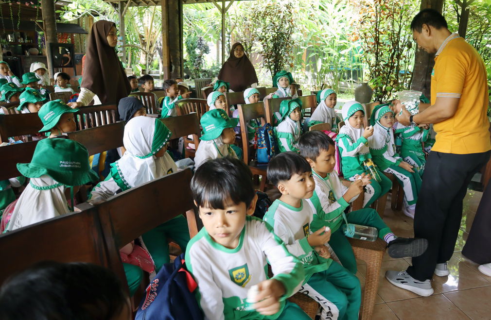 Murid PAUD Mutiara Jimbaran, Badung, Bali dibagikan Minyak Oles Bokashi dalam kegiatan Outing Class di Pak Oles Green School.